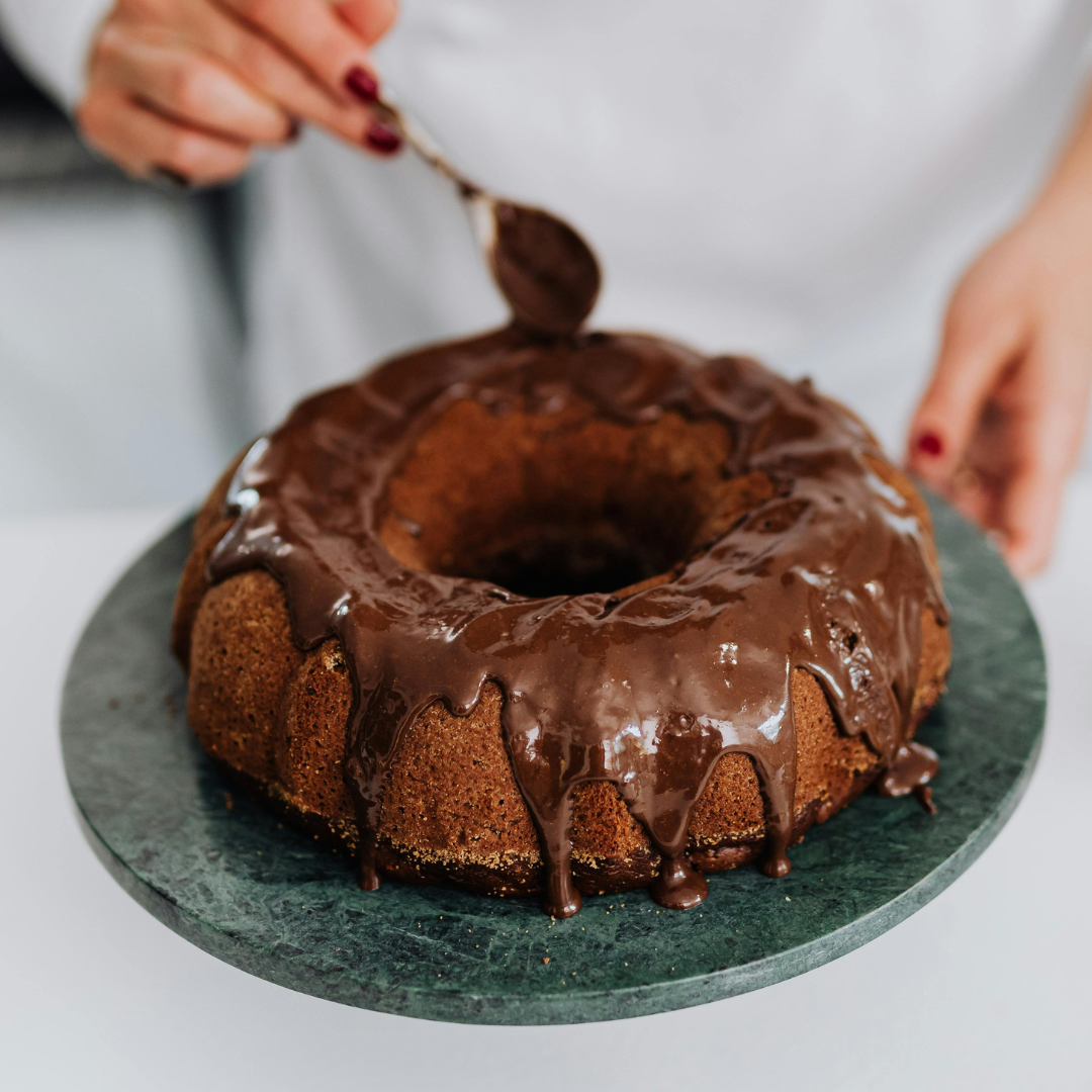 6) Desenforme o bolo já morno e cubra com o ganache. Sirva em seguida ou leve à geladeira para uma cobertura mais firme.